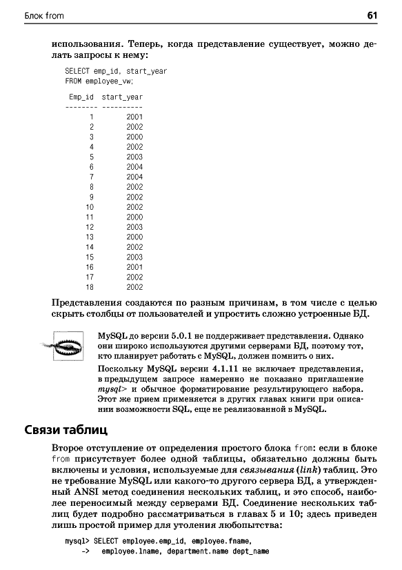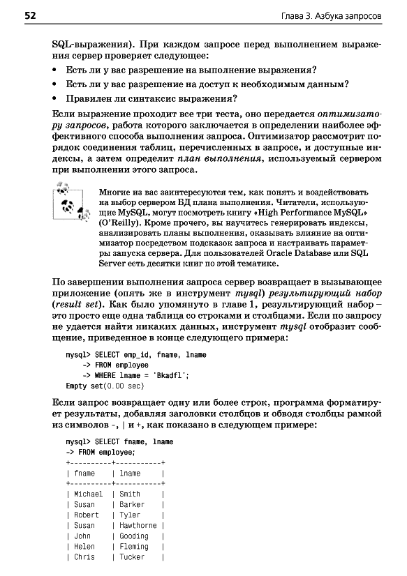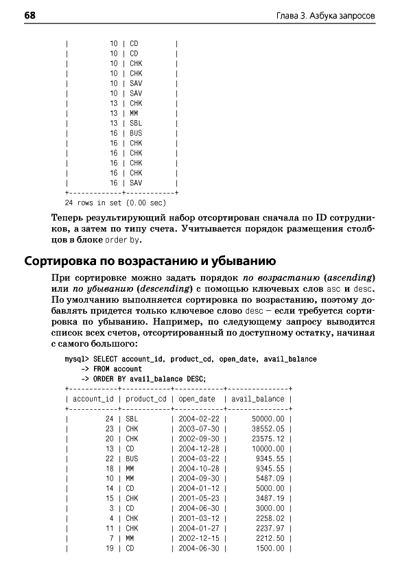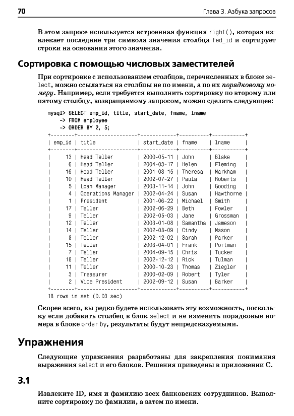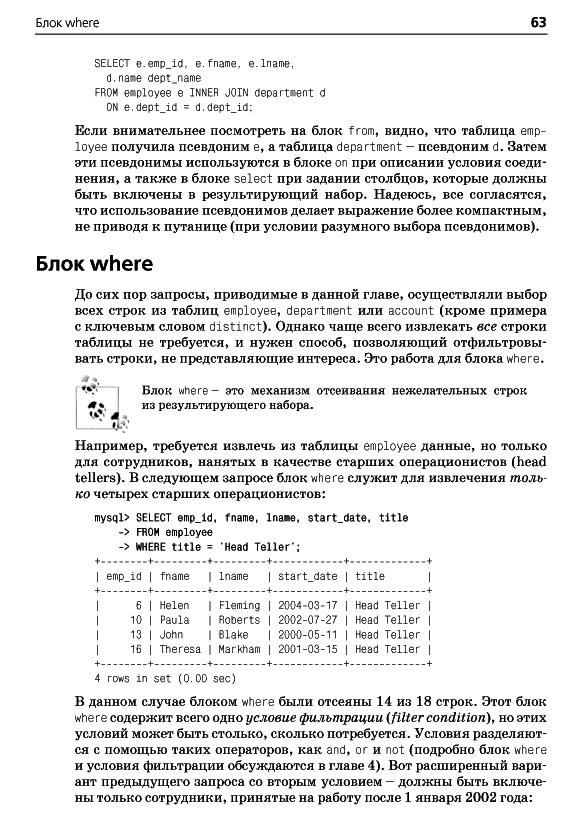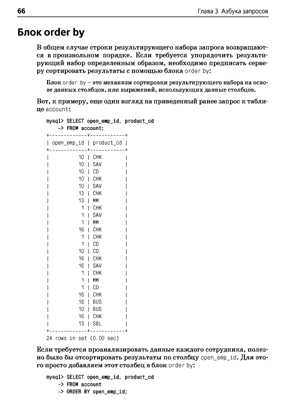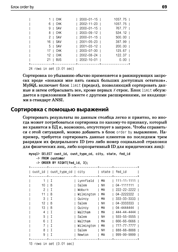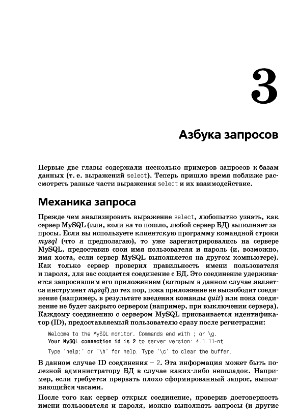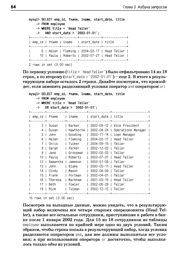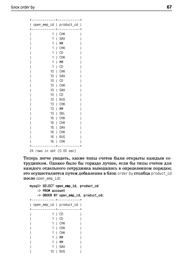 ОглавлениеПредисловиеГлава 1. Немного историиВведение в базы данныхЧто такое SQL?Что такое MySQL?Дополнительные источникиГлава 2. Создание и заполнение базы данныхСоздание базы данных MySQLИнструмент командной строки mysqlТипы данных MySQLСоздание таблицЗаполнение и изменение таблицКогда портятся хорошие выраженияБанковская схемаГлава 3. Азбука запросовМеханика запросаБлоки запросаБлок selectБлок fromБлок whereБлоки group by и havingБлок order byУпражненияГлава 4. ФильтрацияОценка условияСоздание условияТипы условийNULL: это слово из четырех буквУпражненияГлава 5. Запрос к нескольким таблицамЧто такое соединение?Соединение трех и более таблицРекурсивные соединенияСравнение эквисоединений с неэквисоединениямиСравнение условий соединения и условий фильтрацииУпражненияГлава 6. Работа с множествамиОсновы теории множествТеория множеств на практикеОператоры работы с множествамиПравила операций с множествамиУпражненияГлава 7. Создание, преобразование и работа с даннымиСтроковые данныеЧисловые данныеВременные данныеФункции преобразованияУпражненияГлава 8. Группировка и агрегатыПринципы группировкиАгрегатные функцииФормирование группУсловия групповой фильтрацииУпражненияГлава 9. ПодзапросыЧто такое подзапрос?Типы подзапросовНесвязанные подзапросыСвязанные подзапросыИспользование подзапросовКраткий обзор подзапросовУпражненияГлава 10. И снова соединенияВнешние соединенияПерекрестные соединенияЕстественные соединенияУпражненияГлава 11. Условная логикаЧто такое условная логика?Выражение caseПримеры выражений caseУпражненияГлава 12. ТранзакцииМногопользовательские базы данныхЧто такое транзакция?Глава 13. Индексы и ограниченияИндексыОграниченияПриложение А. ER-диаграмма примера базы данныхПриложение B. MySQL-расширения языка SQLПриложение C. Решения к упражнениямПриложение D. Дополнительные источникиАлфавитный указатель